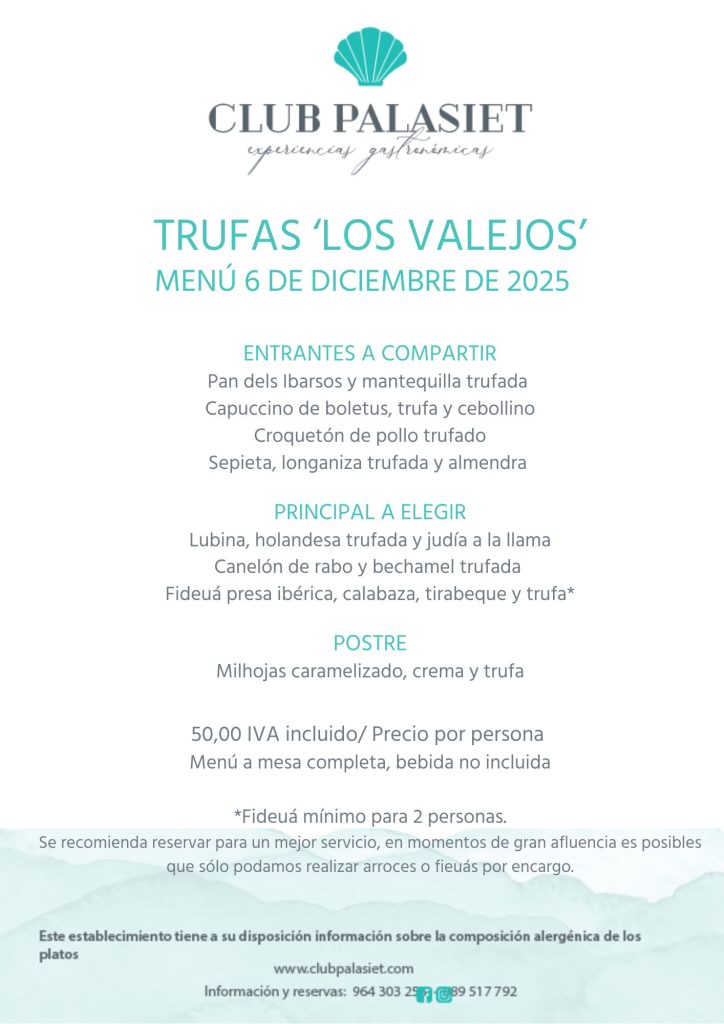 El sábado 6 de diciembre, disfruta de una jornada inolvidable en Club Palasiet con un Taller especializado sobre la trufa donde aprenderás sus formas de cultivo y curiosidades, que será impartido por los los referentes truferos,  «Trufas Los Vallejos». Después del taller, degustaremos el Menú de Trufa que hemos preparado desde Club Palasiet con mucho cariño.